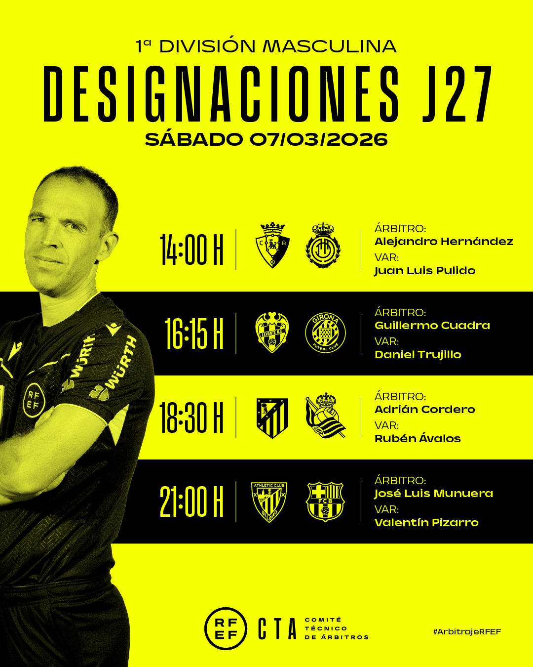 Mientras tanto, el árbitro que ignoró una de las agresiones más claras de los últimos años en LaLiga será el encargado de dirigir uno de los partidos más importantes de la jornada. Si el CTA pretendía demostrar que ya no queda nadie al volante dentro del arbitraje español, la designación de Pizarro Gómez para el Athletic Club – Barcelona es probablemente la prueba más clara posible. Si a final de temporada saliesen públicamente diciendo que toda la temporada ha sido una cámara oculta, sería totalmente creíble.