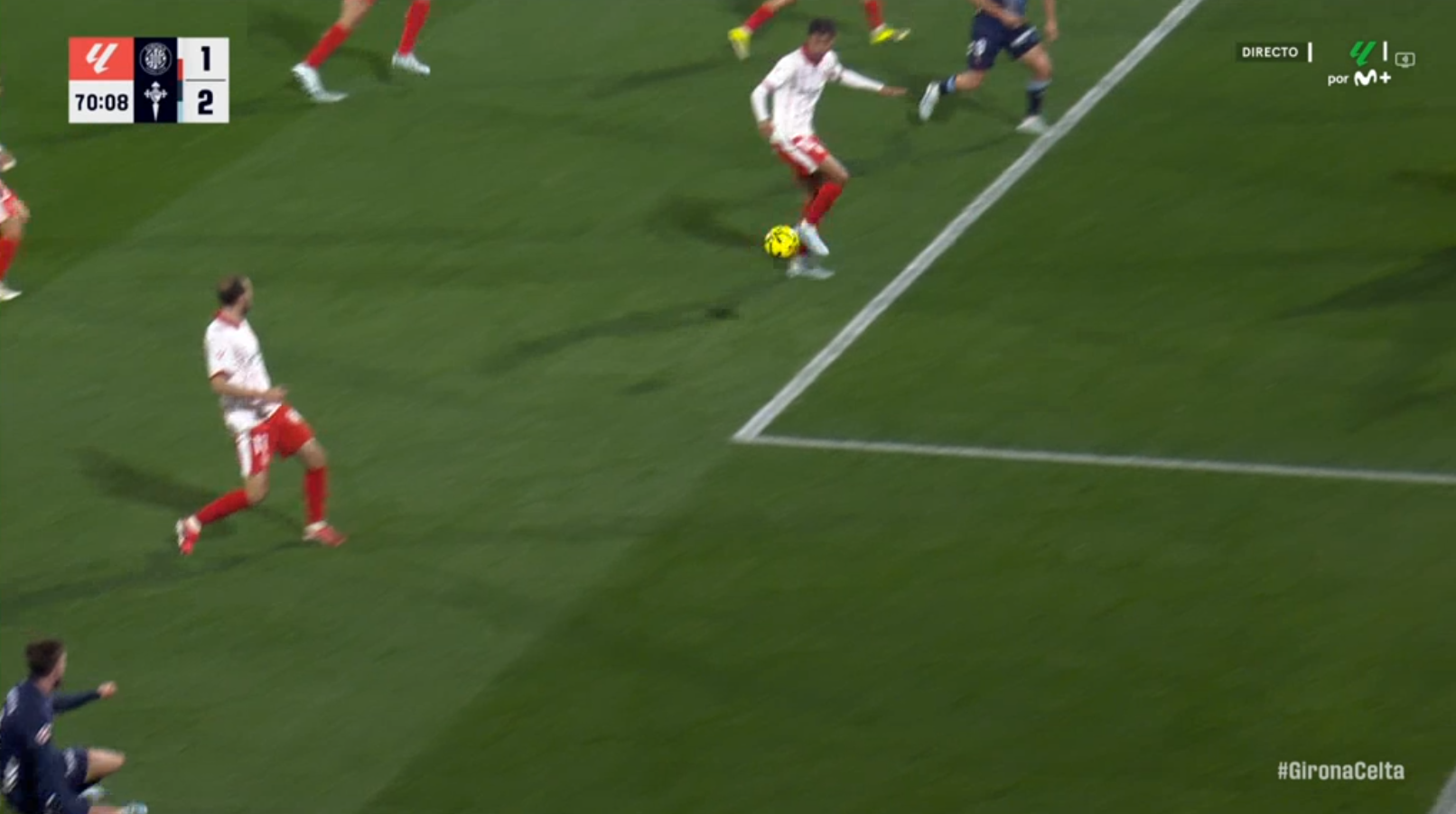 En esta jugada no se cumple ninguno de los cuatro puntos. Jutglà no obstruye la visión de Vitor Reis. No disputa el balón. No realiza un movimiento que condicione su despeje. Y no afecta de manera alguna a la posibilidad real de que el defensor juegue el balón.