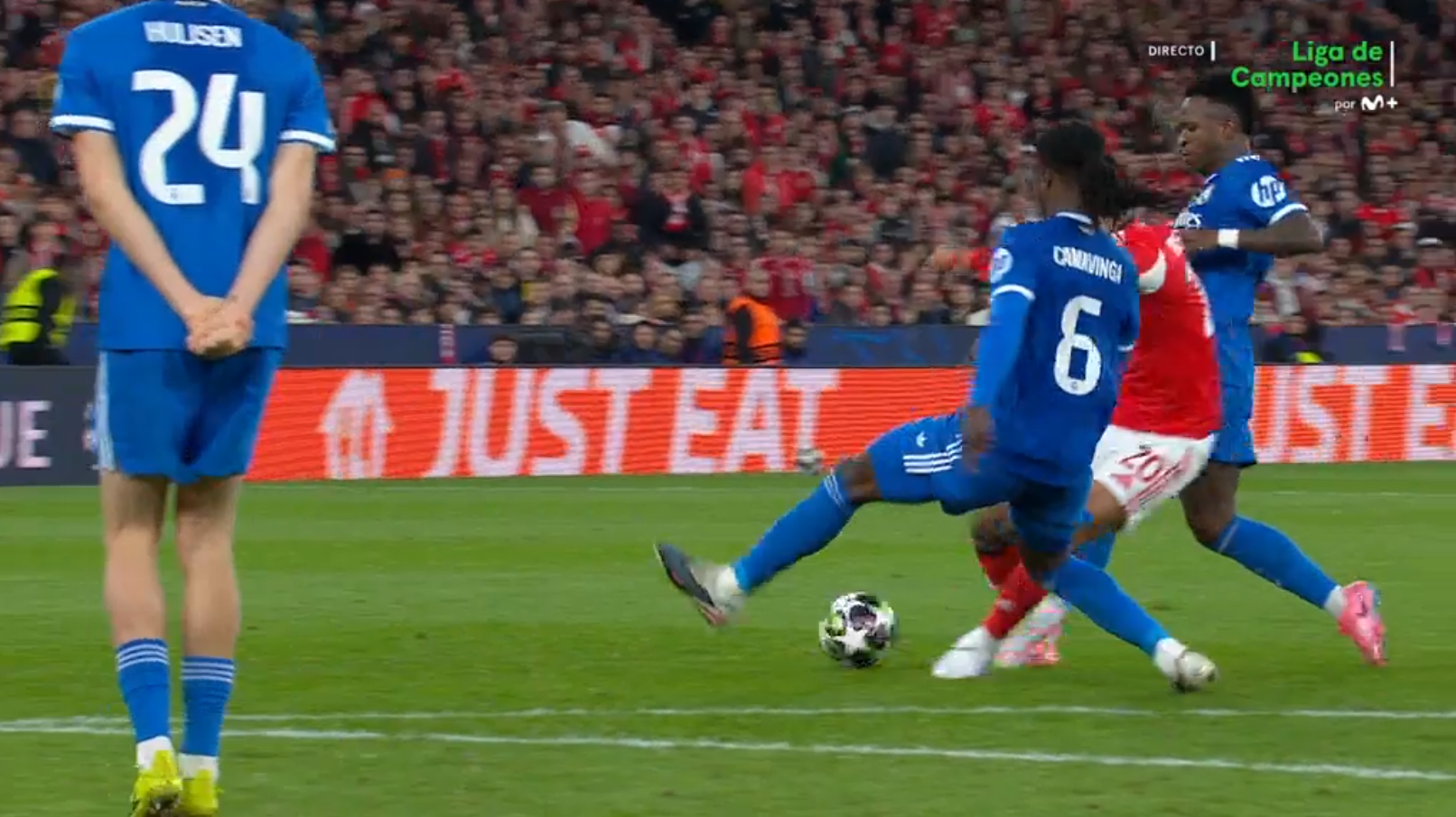 La acción más grave del partido fue la agresión de Fede Valverde a Dahl en un saque de banda. Antes incluso de disputarse el balón, el uruguayo golpea con la mano el rostro del lateral del Benfica. La repetición es clara: hay un movimiento de brazo hacia la cara con uso de fuerza excesiva.