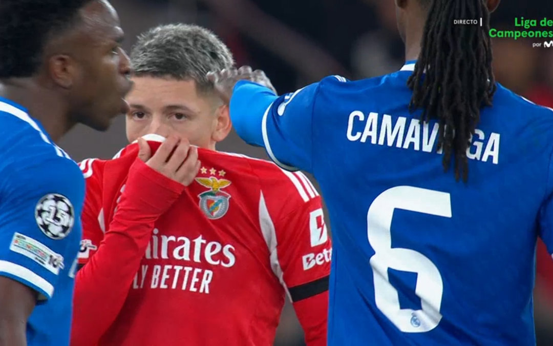 La acción más grave del partido fue la agresión de Fede Valverde a Dahl en un saque de banda. Antes incluso de disputarse el balón, el uruguayo golpea con la mano el rostro del lateral del Benfica. La repetición es clara: hay un movimiento de brazo hacia la cara con uso de fuerza excesiva.