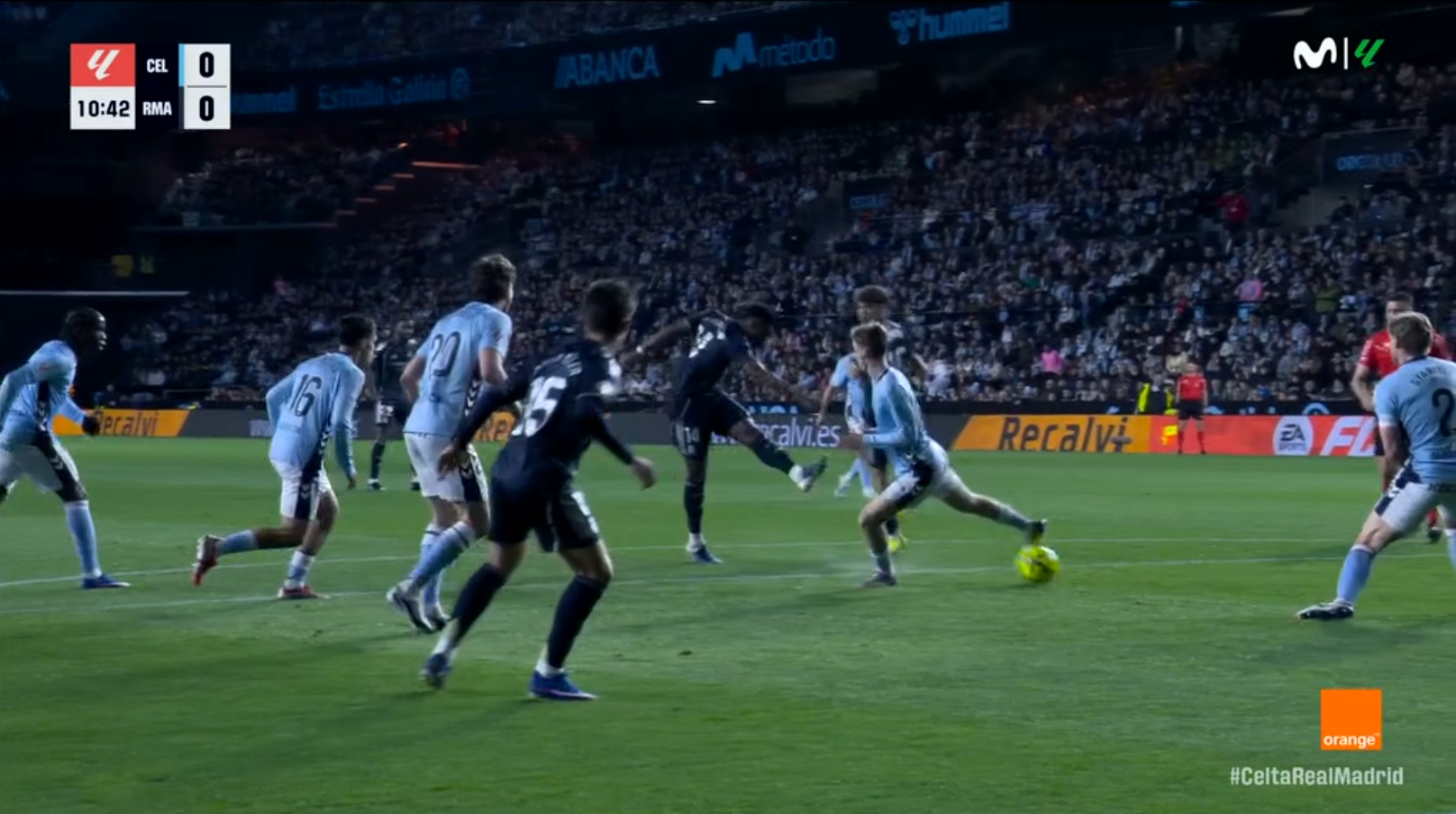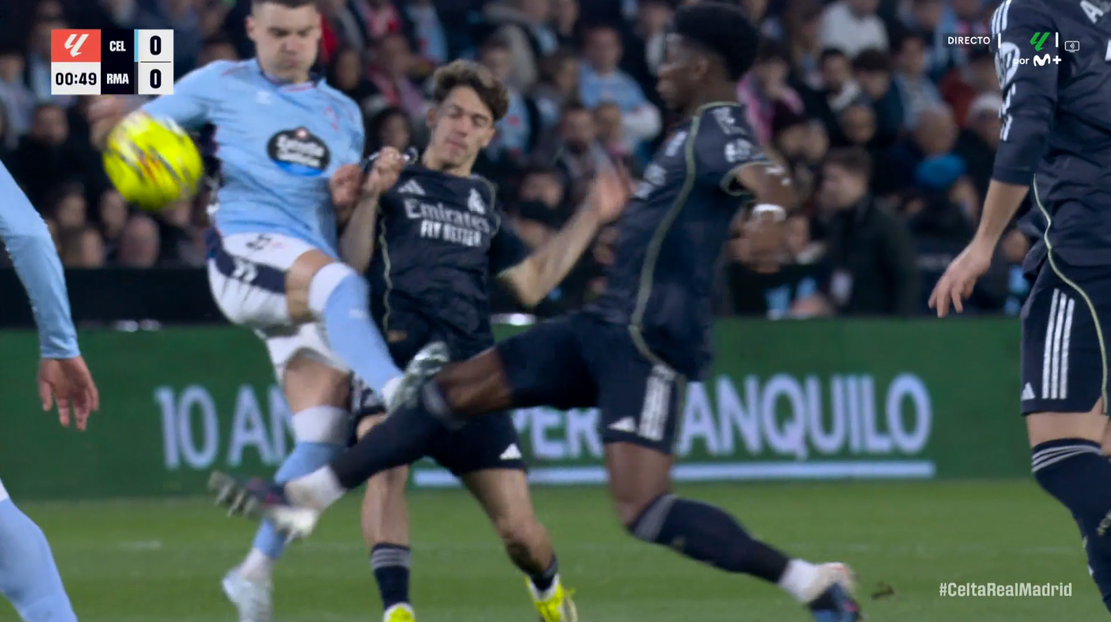 La primera gran polémica llegó prácticamente con el pitido inicial. En el segundo 37 de partido se produjo un balón dividido al que acudieron Tchouaméni, Thiago y Ferran Jutglà. El jugador del Real Madrid consiguió puntear primero el balón hacia arriba y, en ese momento, Jutglà llegó con la plancha intentando disputar la jugada. El resultado fue un impacto muy feo de los tacos del jugador del Celta directamente contra la rodilla de Tchouaméni. La acción es muy clara: una entrada con plancha, tacos y rodilla que, como mínimo, debió ser sancionada con falta y tarjeta amarilla, y que incluso admite perfectamente la tarjeta roja directa por juego peligroso.
