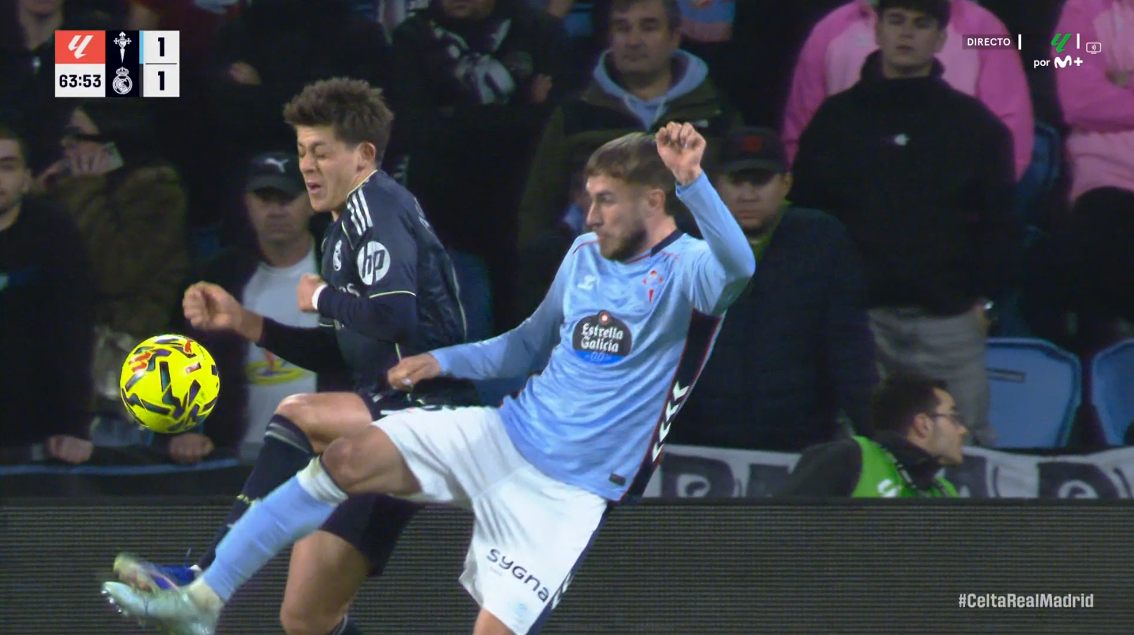 The fifth and final incident is the one that generated the most debate, as it led to the recovery that eventually produced Real Madrid’s winning goal. In the play, Fer López initially controls the ball but lets it run slightly away from him. Manuel Ángel arrives from the side and manages to poke the ball first before the Celta player.