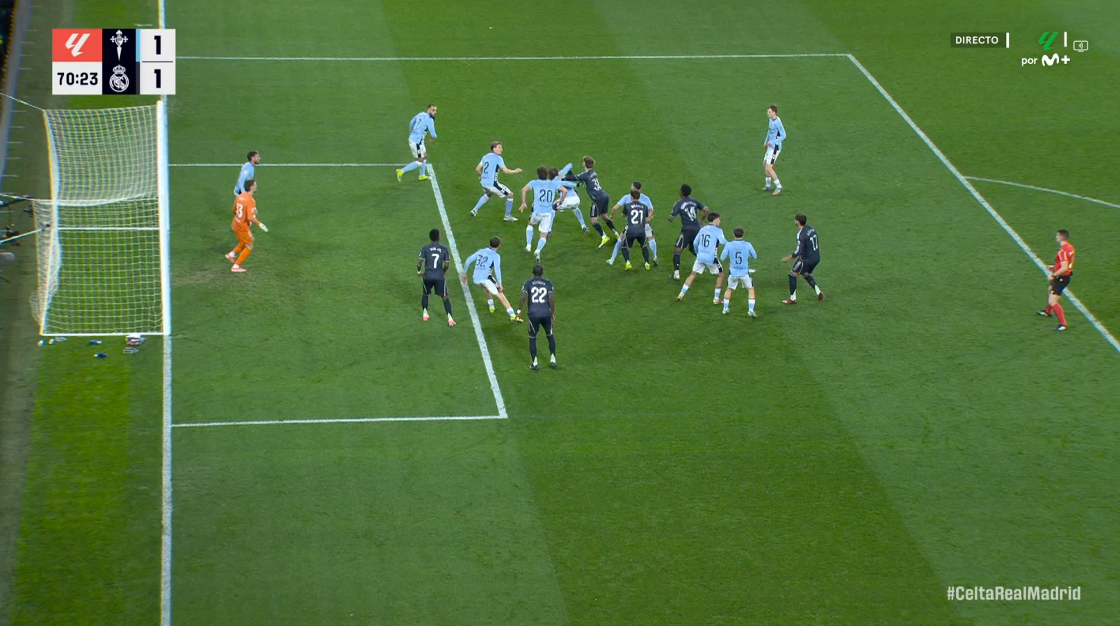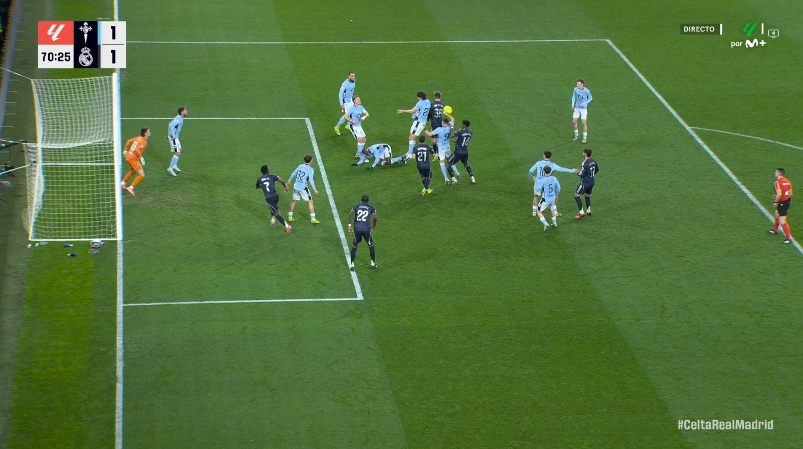 However, Díaz de Mera did not signal anything at all. It can be understood that he may not have seen the incident clearly due to the number of players involved, but the assistant referee was in a good position to detect it. The fact that not even a foul was awarded turns this moment into one of the most serious mistakes of the match. Had it been punished correctly, Celta would have played almost the entire game with ten men.