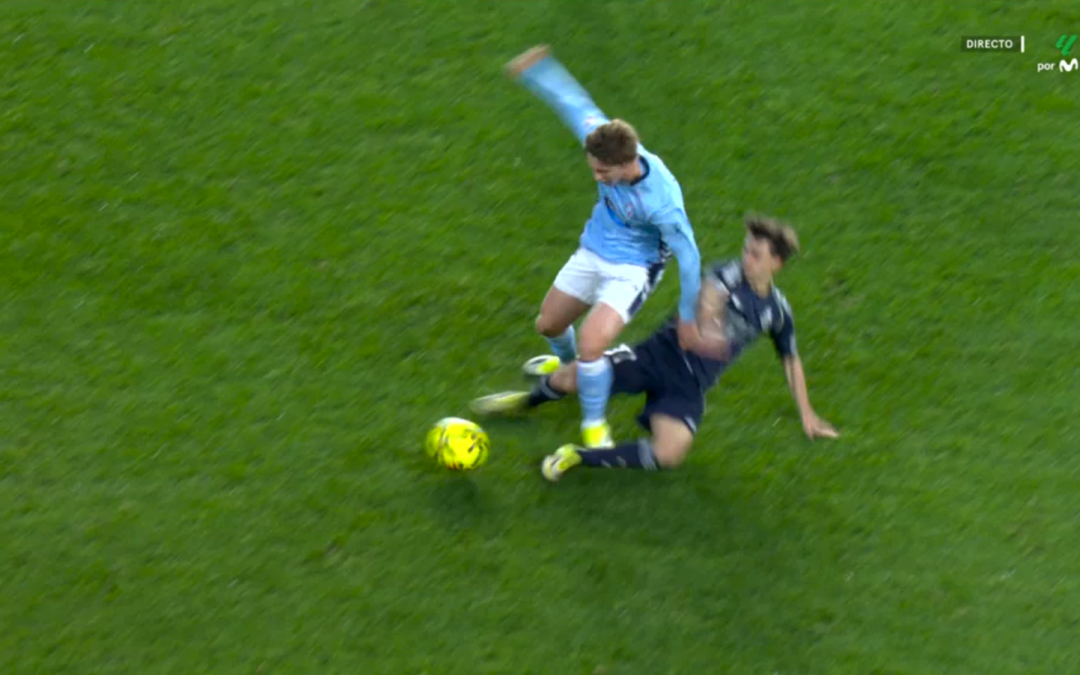 También es importante diferenciar este tipo de situaciones de otras que sí se sancionan como falta. Por ejemplo, cuando un jugador centra el balón y después recibe un impacto claro en la pierna de apoyo. En ese caso, aunque el balón ya haya salido de su pie, el contacto puede ser punible porque la acción del jugador todavía forma parte de la jugada ofensiva si existe temeridad. Aquí ocurre lo contrario: Fer López pierde la posesión al intentar proteger el balón y fallar en ese intento, y el contacto posterior llega cuando la jugada ya ha cambiado de dueño.