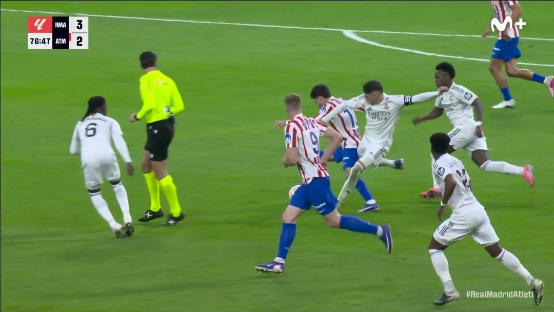 La primera acción polémica del partido llegó en la primera parte, en una internada de Marcos Llorente dentro del área. Llorente dispara con la pierna izquierda y, tras el remate, Carvajal llega tarde y se lo lleva por delante, provocando una caída muy aparatosa en la que incluso el jugador del Atlético se golpea la cabeza contra el suelo. Esta acción generó mucha polémica por la violencia de la caída, pero hay que analizar la jugada desde la lógica arbitral. Llorente remata en carrera con la zurda y pierde el equilibrio en el momento del disparo, es decir, ya está cayéndose antes del contacto. Carvajal llega tarde y le golpea cuando el jugador ya está desequilibrado, provocando que la caída sea más aparatosa, pero el contacto es residual y no temerario.